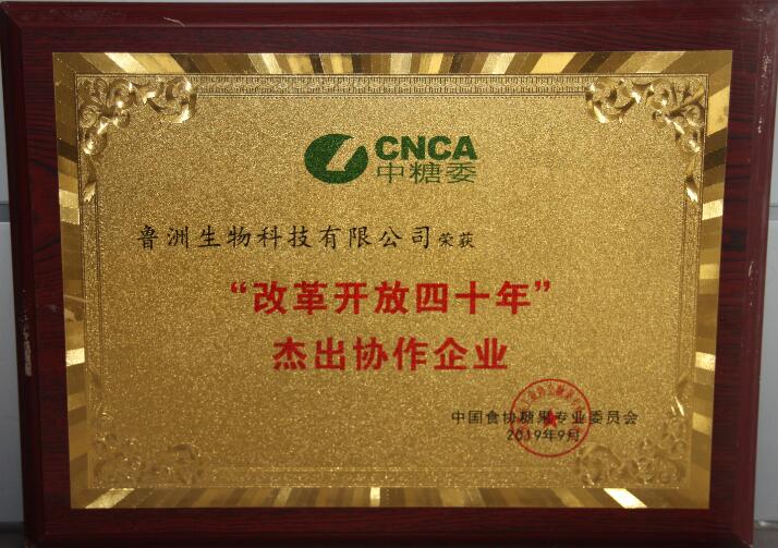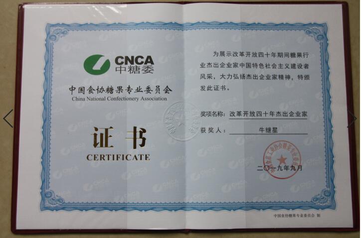 魯洲生物科技有限公司榮獲中國食協(xié)糖果專業(yè)委員會 “改革開放四十年”杰出協(xié)作企業(yè),董事長牛繼星榮獲“改革開放四十年”杰出企業(yè)家。